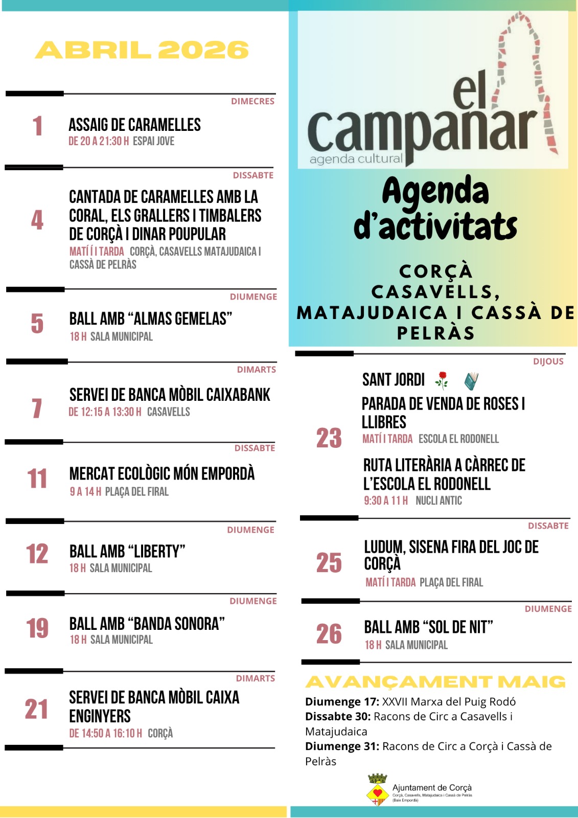 CARAMELLES des de 1985 Dilluns 30 de març, dimecres 1 i dissabte 4 d’abril de 2026 PROGRAMACIÓ: Dilluns 30 de març Assaig de caramelles De 20 a 21:30 h Espai Jove Dimecres 1 d’abril Assaig de caramelles De 20 a 21:30 h Espai Jove Dissabte 4 d’abril Passada caramellaire amb la Coral de Corçà, els ... Read more |