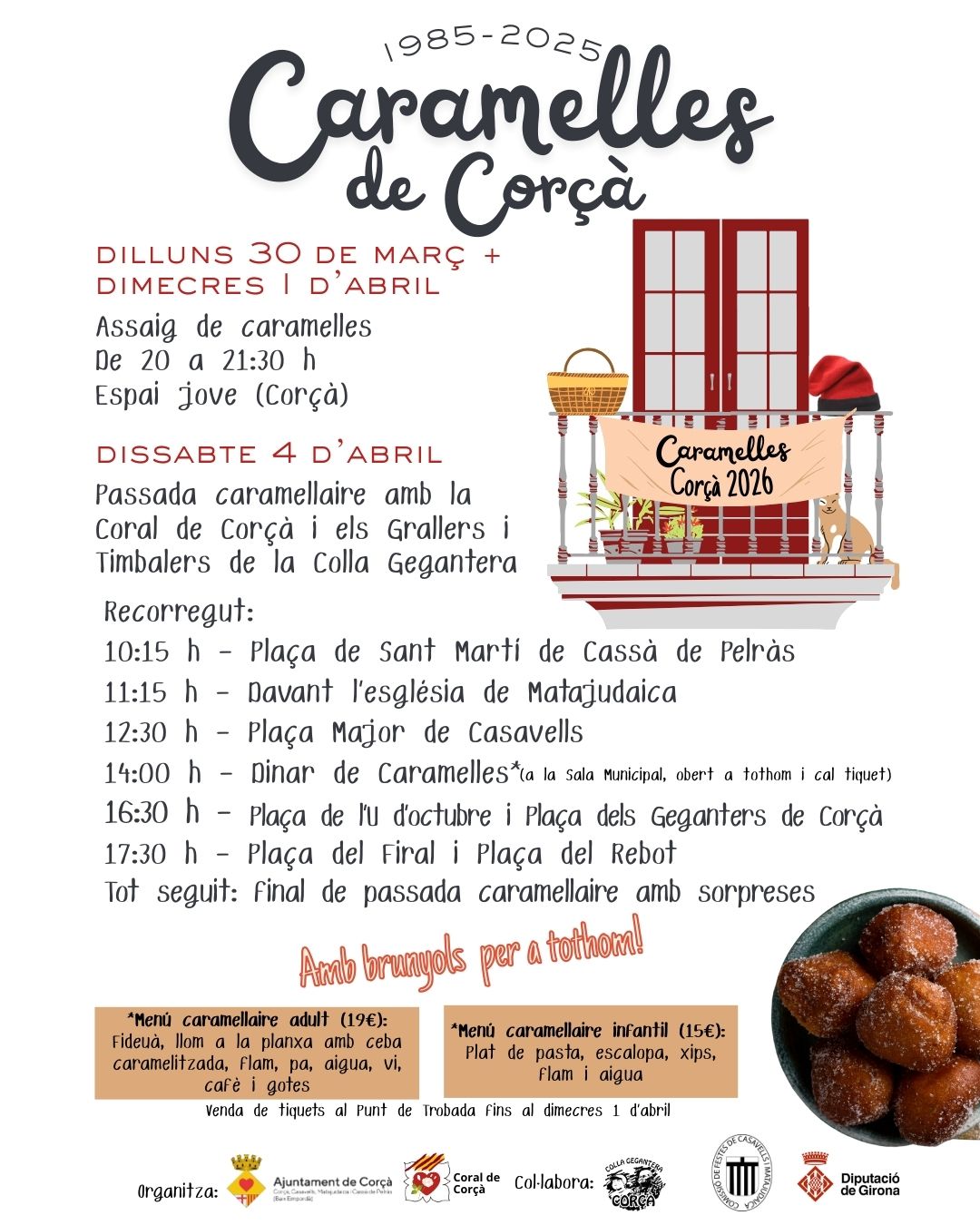 CARAMELLES, des de 1985 Dilluns 30 de març, dimecres 1 i dissabte 4 d’abril de 2026 PROGRAMACIÓ: Dilluns 30 de març Assaig de caramelles De 20 a 21:30 h Espai Jove Dimecres 1 d’abril Assaig de caramelles De 20 a 21:30 h Espai Jove Dissabte 4 d’abril Passada caramellaire amb la Coral de Corçà, els ... Read more |