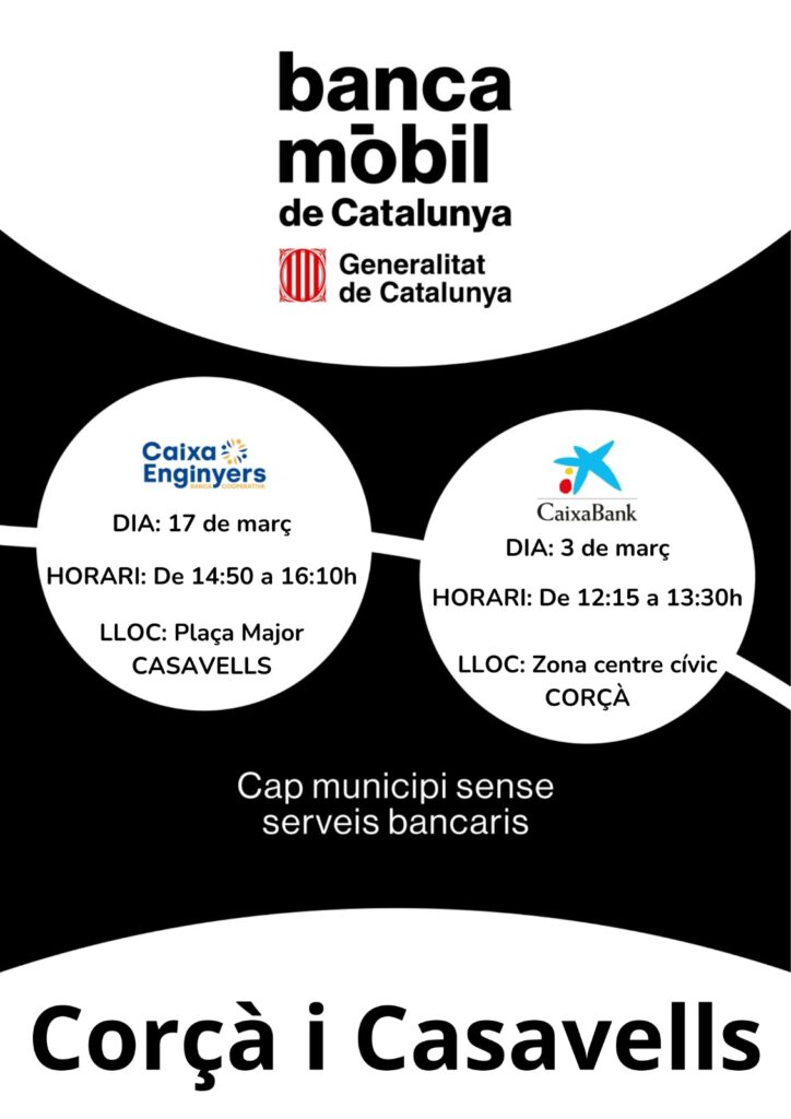 A continuació us actualitzem el calendari de les dues properes dates: el dimarts 3 de març, tindrem el servei de Caixabank de 12:15 a 13:30 h a Corçà i el dimarts 17 de març, el servei de Caixa d’Enginyers estarà a Casavells de 14:50 a 16:10 h.