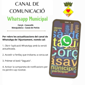 El servei té únicament un caràcter informatiu i no substitueix cap tràmit administratiu, ni notificació oficial. Tampoc serveix com a canal perquè els usuaris comuniquin incidències o queixes. Les comunicacions amb l’Ajuntament seguiran com fins ara, pel registre d’entrada o bé a través del correu electrònic: ajuntament@corca.cat.