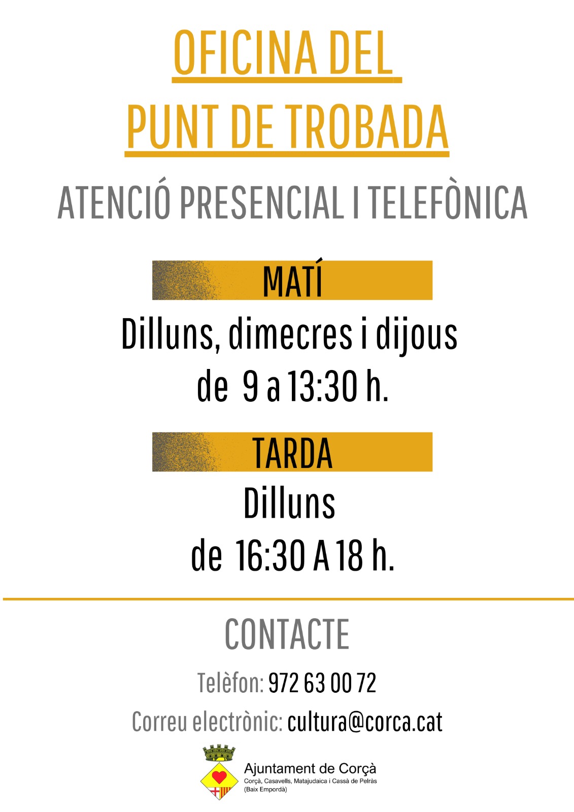 PUNT DE TROBADA | ÀREA DE CULTURA DE CORÇÀ Per una millor organització dels servei, us informem dels nous horaris d’atenció al públic del Punt de Trobada | Àrea de Cultura. Podreu trobar obert dilluns, dimecres i dijous de 9 a 13:30 h i el dilluns a la tarda de 16:30 a 18 h. Tel. … Read more