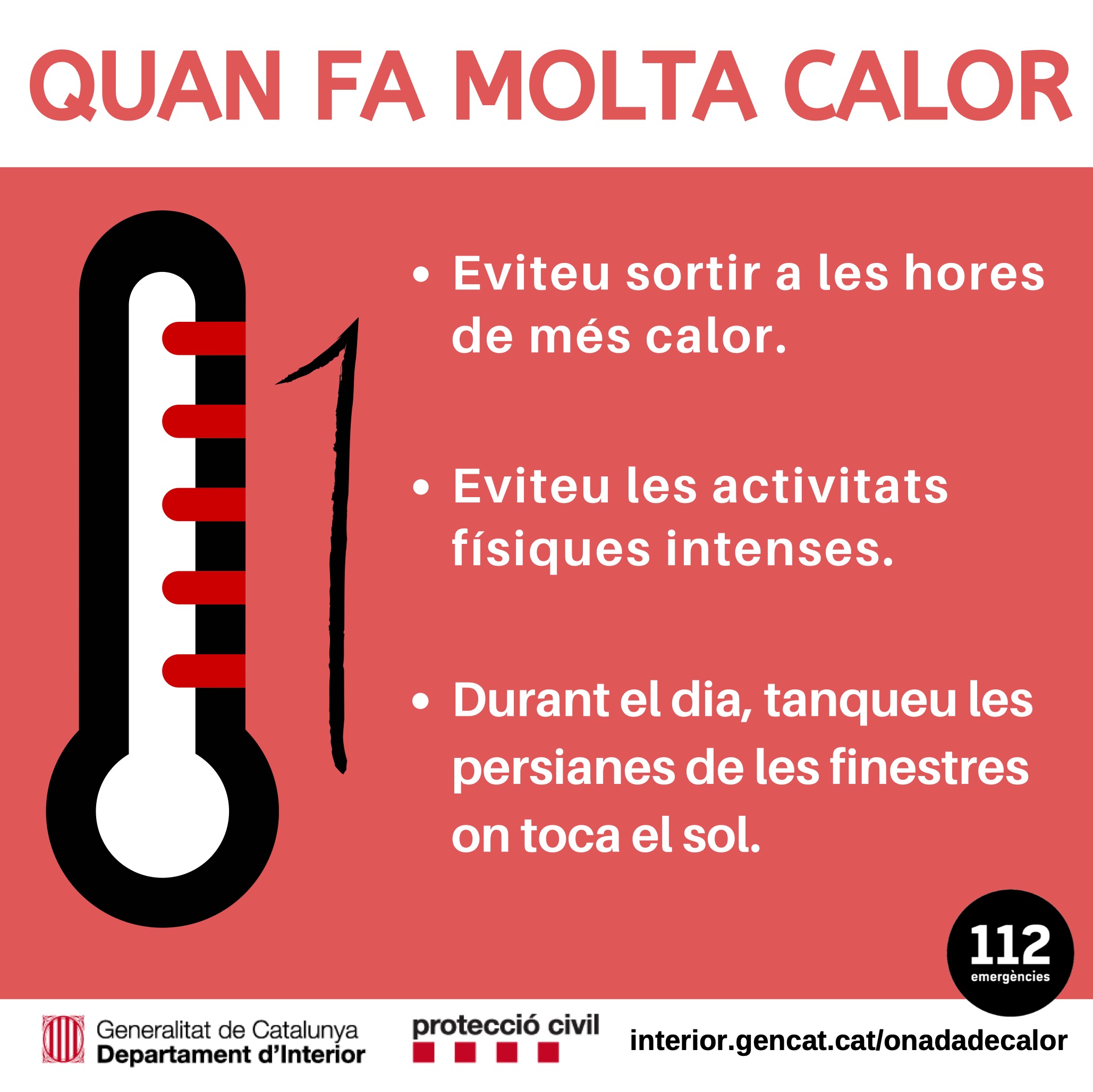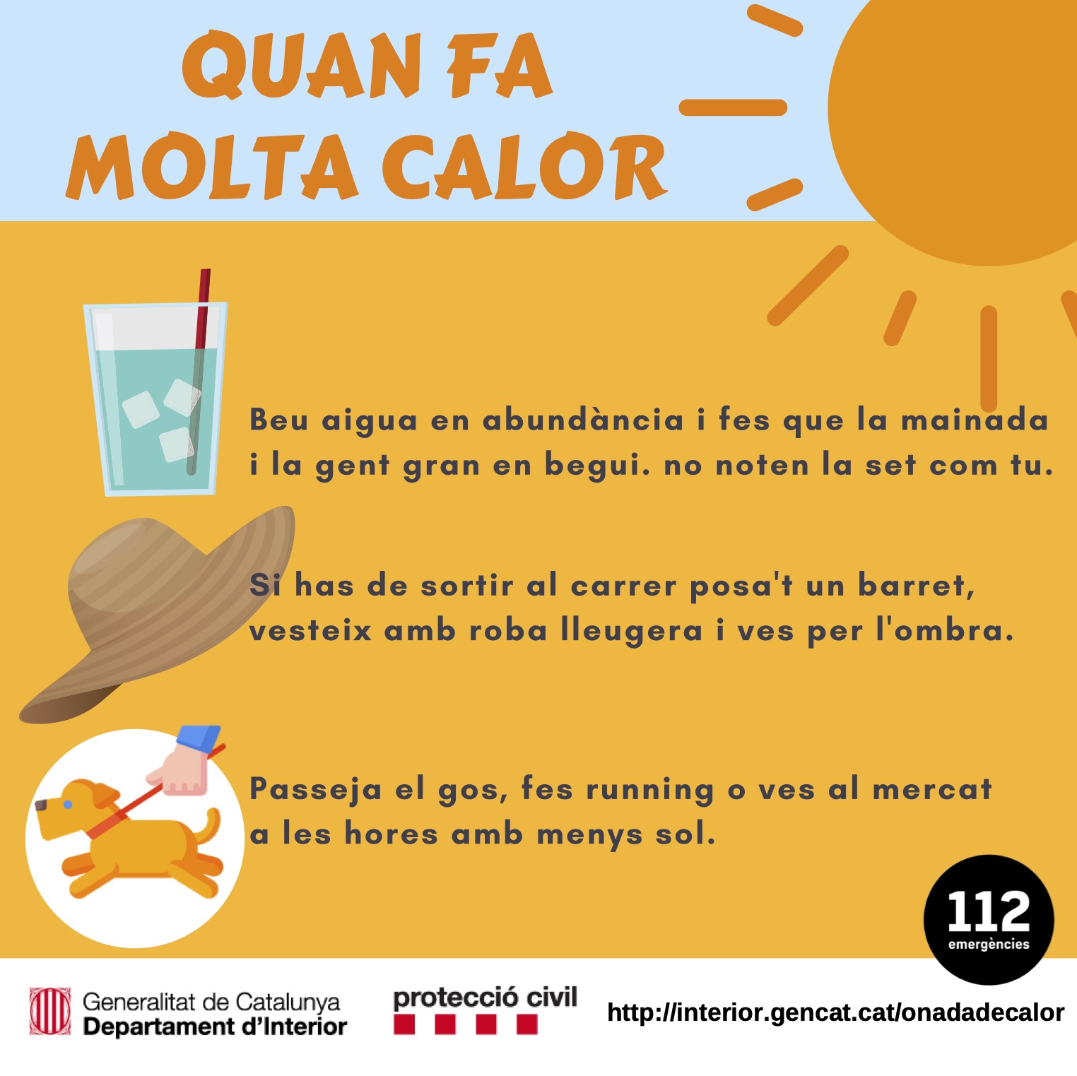 5. Persones amb malalties cròniques, mainada i gent gran són els qui més pateixen els efectes de la calor severa. Cal que s’hidratin sovint. Cal tenir en compte que els infants i les persones grans no tenen sensació de set encara que s’estiguin deshidratant.