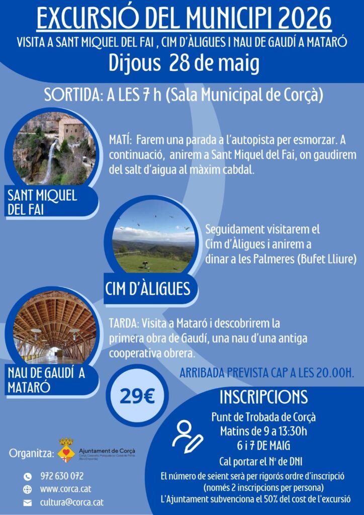 Sortida a les 7 h (Sala Municipal de Corçà). Farem un parada a l’autopista per esmorzar. A continuació, anirem a Sant Miquel del Fai, on gaudirem del salt d’aigua al màxim cabal. Seguidament visitarem el Cim d’Àligues i anirem a dinar a les Palmetes (bufet lliure). A la tarda visita a Mataró i descobrirem la primera obra de Gaudí, una nau d’una antiga cooperativa obrera.