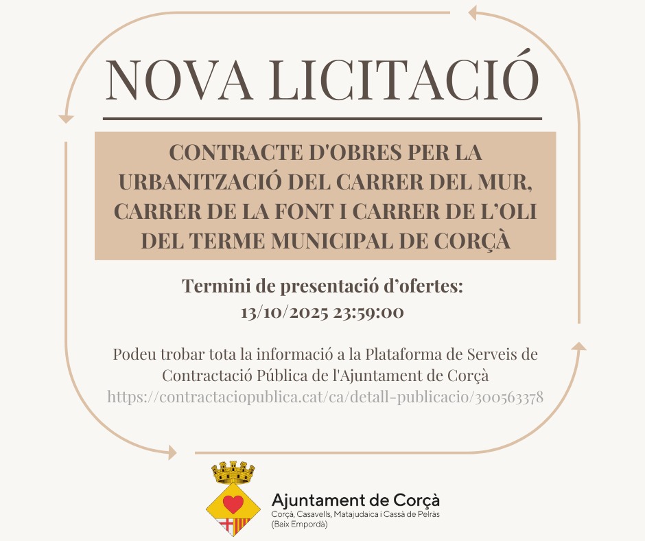 Per tenir tota la informació i presentar ofertes podeu accedir a la plataforma de Contractació de l’Ajuntament de Corçà: enllaç